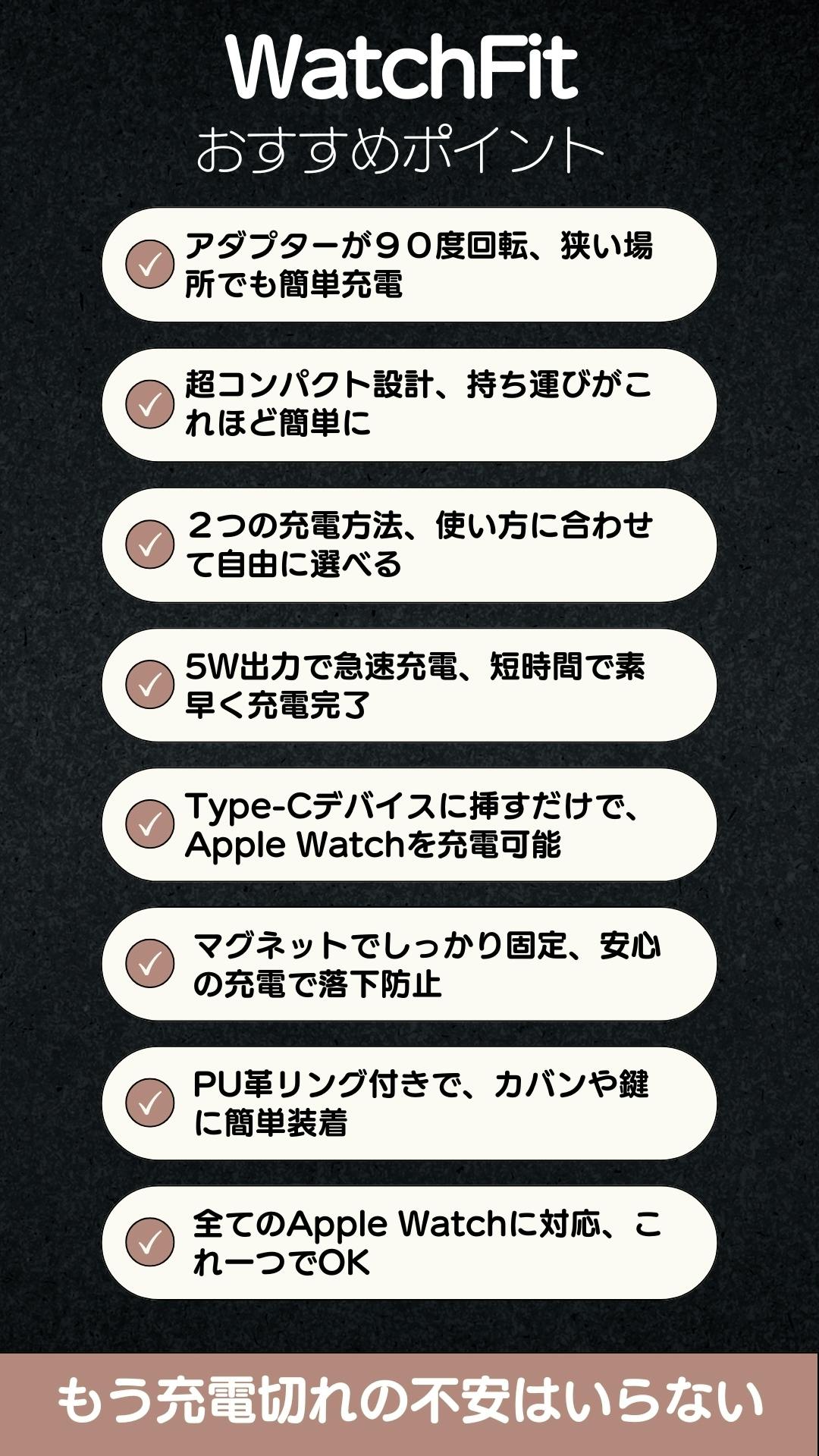Apple Watchシリーズ1~9、SE、ULTRAまで、すべてのモデルに対応しているので、どのApple Watchでも安心して使えます。新しいモデルが出ても、「WatchFit」を引き続き使えるため、長く使える充電器として安心です。