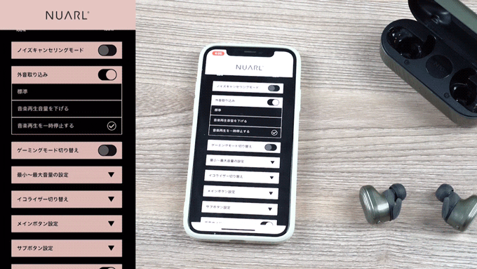 ワイヤレスイヤホンの操作ボタンを通じて、スマートフォンの音楽再生操作や着信操作が可能であり、ノイズキャンセリングと外音取り込みのON/OFFも簡単に行えます。